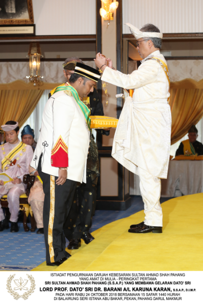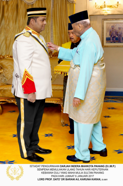 Dr. Barani Karunakaran was conferred the Darjah Indera Mahkota Pahang (D.I.M.P.), which carries the title of Dato’ in 2016 by His Majesty Sultan of Pahang. In 2018, Dr. Barani was conferred distinguished "Darjah Sri Sultan Ahmad Shah Pahang (S.S.A.P.)," which carries the title Dato’ Sri by His Majesty Sultan of Pahang. The ruling Sultan awards these titles on his birthday in recognition of Barani Karunakaran's outstanding development in businesses and philanthropy works. The Malaysian honors system is similar to the British, which rewards individuals' bravery, achievement, or service to the nation.