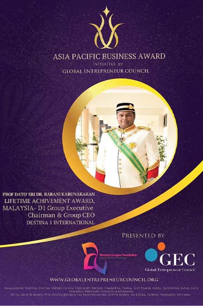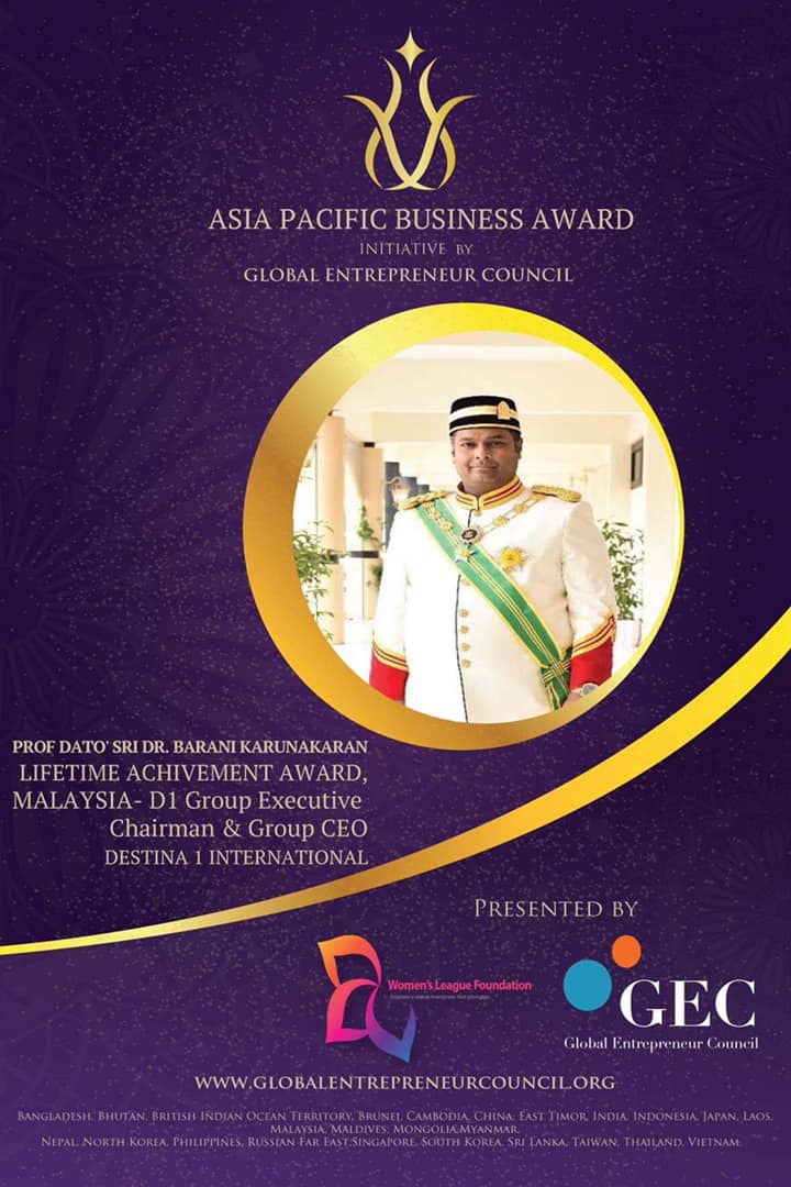 Dato’ Sri Dr Barani Karunakaran has been conferred The Asia Pacific Business Award’s “LIFETIME ACHIEVEMENT AWARD FOR 2019” by Global Entrepreneur Council.